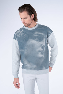 Mikina je volného střihu a je vyhotovena z 50 % z recyklovaných vláken bavlny a denimu, které určují její přirozené zabarvení. Na přední díl jsme vytvořili surrealistický potisk hlavy Davida. Takto sportovně střižená mikina je vhodným doplňkem jak k jeansům tak i k teplákům.
