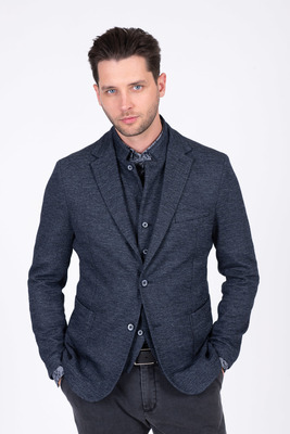 Modré sako ze směsové bavlny a vlny od italského výrobce materiálů Fortex. Sako je ušité v přiléhavém střihu, který kopíruje postavu. Doporučujeme pro neformální příležitosti.