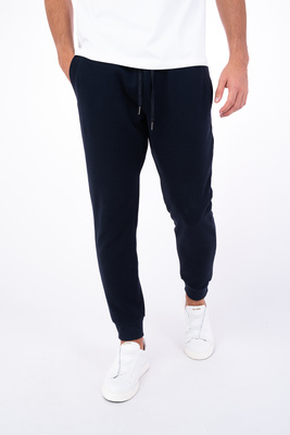 Tmavě modré tepláky ze směsové bavlny. Tepláky jsou ušité ve standardním střihu pro větší pohodlí. Doporučujeme pro neformální příležitosti.