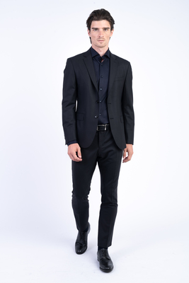 Černý oblek z vlny s příměsí elastanu. Oblek je ušitý v přiléhavém střihu, který kopíruje postavu. Doporučujeme pro formální příležitosti.