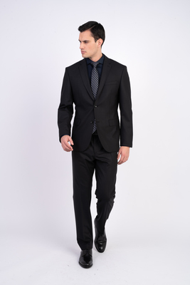 Černý oblek z vlny s příměsí elastanu. Oblek je ušitý ve volném střihu pro větší pohodlí. Doporučujeme pro formální příležitosti.