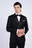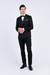 Základ tohoto černého obleku tvoří dvouřadové, čtyř knoflíkové sako se širší lesklou klopou, střiženou do špicfazony. Kalhoty, které mají užší lampas v bočním švu, dotvoří celkový vzhled obleku.