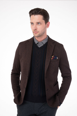 Černo hnědé sako ze směsové bavlny s příměsí elastanu od italského výrobce materiálů Lanificio Roma. Sako je ušité v přiléhavém střihu, který kopíruje postavu. Doporučujeme pro neformální příležitosti.