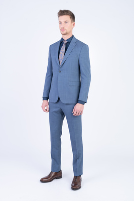 Modrý oblek ze směsové vlny s příměsí elastanu. Oblek je ušitý v přiléhavém střihu, který kopíruje postavu. Doporučujeme pro formální příležitosti.