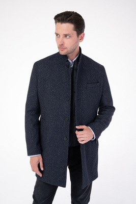 Plášť je vyhotoven z kvalitní vlněné tkaniny s příměsí bavlny a technickým materiálem pro vyšší trvanlivost. Lícní stranu tkaniny v modrém odstínu tvoří struktura opakujícího se jemného pruhu v kombinaci se světle modrou nití. Podšívka s vytkávaným logem lva.