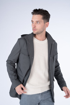 Bunda je vyhotovena z kvalitního, mírně pružného funkčního materiálu. Lícní strana „doubleface“ tkaniny je v grafitově šedém tónu, vnitřní strana bundy je černá.
