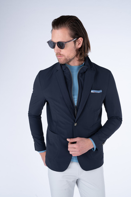 Sako je z ultralehké nylonové tkaniny s termovložkou v modrém tónu. Odepínací vsadka je ze stejného materiálu jako sako.