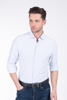 Bílo modrá košile ze směsové bavlny s příměsí elastanu od italského výrobce materiálů Albini. Košile je ušitá v přiléhavém střihu, který kopíruje postavu. Doporučujeme pro neformální příležitosti.