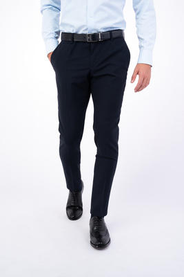 Tmavě modré kalhoty ze směsové vlny s příměsí elastanu. Kalhoty jsou ušité v přiléhavém střihu, který kopíruje postavu. Doporučujeme pro neformální příležitosti.