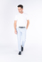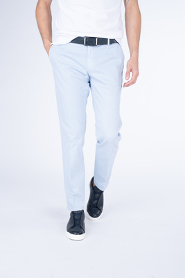 Světle modré kalhoty z bavlny s příměsí elastanu. Kalhoty jsou ušité v přiléhavém střihu, který kopíruje postavu. Doporučujeme pro neformální příležitosti.