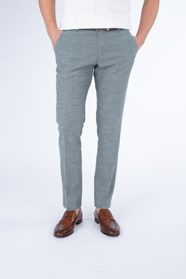 Šedo světle zelené kalhoty z vlny, bavlny a lnu s příměsí elastanu od italského výrobce materiálů Tollegno. Kalhoty jsou ušité v přiléhavém střihu, který kopíruje postavu. Doporučujeme pro formální příležitosti.