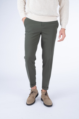 Khaki kalhoty ze směsové vlny s příměsí elastanu od portugalského výrobce materiálů Oliveira. Kalhoty jsou ušité v uvolněném střihu pro větší pohodlí. Doporučujeme pro neformální příležitosti.