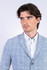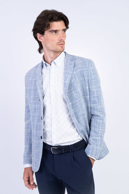 Bílo modro béžové sako z vlny, bavlny a lnu s příměsí elastanu od italského výrobce materiálů Tollegno. Sako je ušité ve standardním střihu pro větší pohodlí. Doporučujeme pro neformální příležitosti.