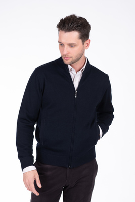 Tmavě modrý svetr z merino vlny a bavlny. Svetr je ušitý ve standardním střihu pro větší pohodlí. Doporučujeme pro neformální příležitosti.