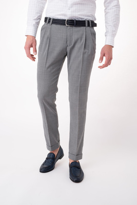 Bílo černé kalhoty ze směsové vlny s příměsí elastanu od portugalského výrobce materiálů Oliveira. Kalhoty jsou ušité ve standardním střihu pro větší pohodlí. Doporučujeme pro neformální příležitosti.