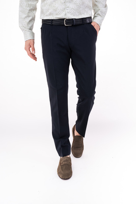 Tmavě modré kalhoty ze směsové vlny s příměsí elastanu. Kalhoty jsou ušité v přiléhavém střihu, který kopíruje postavu. Doporučujeme pro neformální příležitosti.
