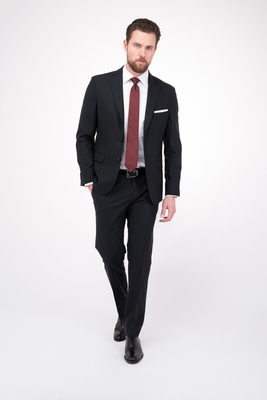 Černý oblek z vlny s příměsí elastanu. Oblek je ušitý v přiléhavém střihu, který kopíruje postavu. Doporučujeme pro slavnostní příležitosti.