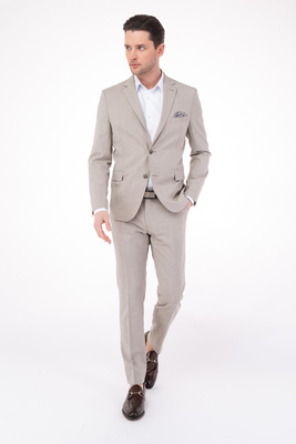 Béžový oblek z vlny, hedvábí a lnu od italského výrobce materiálů Marzotto. Oblek je ušitý v přiléhavém střihu, který kopíruje postavu. Doporučujeme pro formální příležitosti.